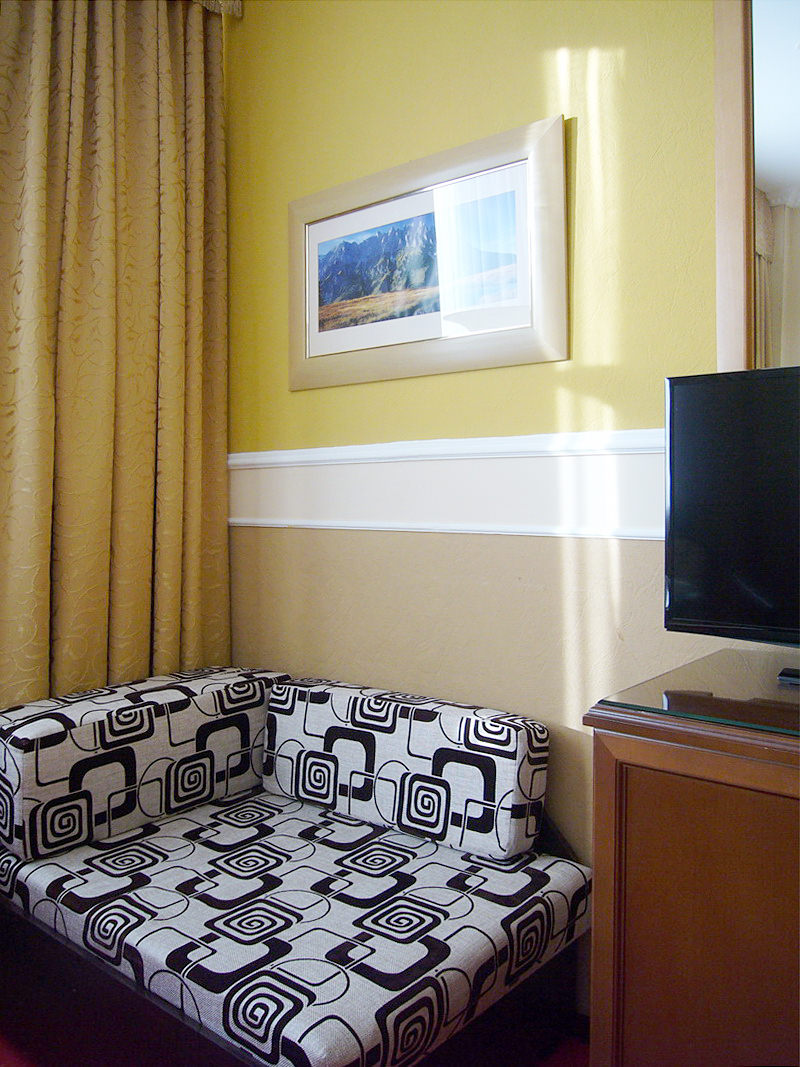 В номере есть Wi-Fi, телефон и ТВ. Из мебели имеются: журнальный столик, зеркало, письменный стол, стулья, тумбочки прикроватные, шкаф для одежды.